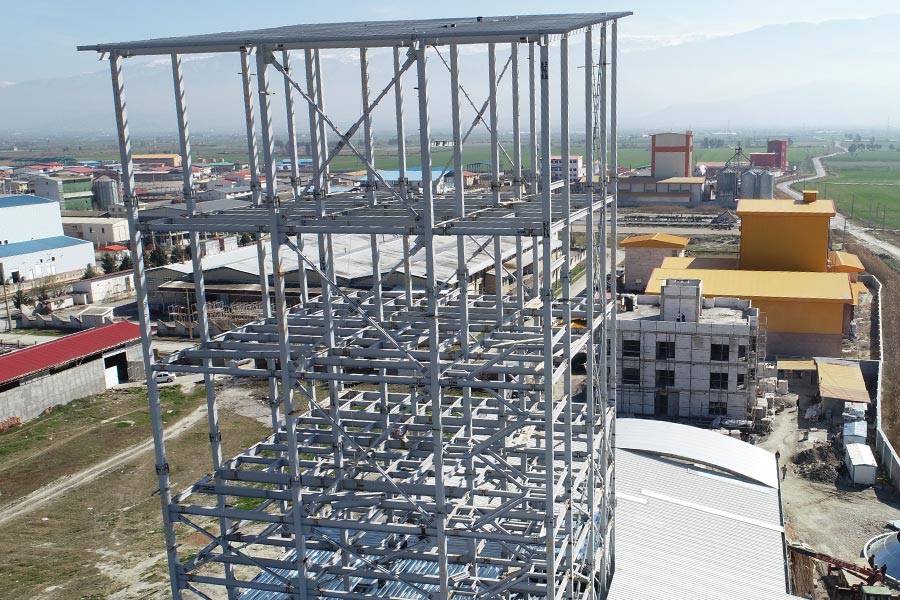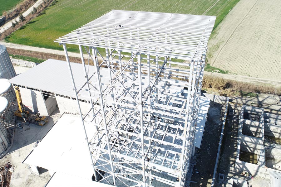 This industrial steel structure, with a total weight of 300 tons, was specifically designed and constructed to support grain production and storage processes. Every stage—fabrication, transportation, and installation—was carried out with precise engineering oversight and the use of high‑quality materials, ensuring top‑tier durability, operational efficiency, and safety standards.